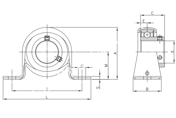 Подшипниковые узлы с самоустанавливающимся подшипником UC, со стопорным винтом, корпус типа P из стали, на лапах.Характеристики